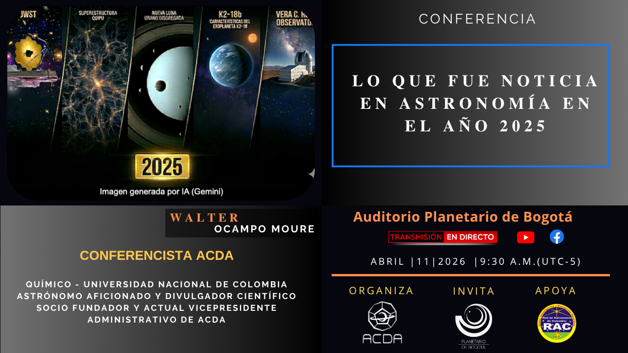 En esta conferencia se mostrarán los principales logros obtenidos en el campo de la astronomía durante el año 2025, entre los que se cuentan los nuevos aportes del Telescopio Espacial James Webb, el descubrimiento de la superestructura Quipu, la polémica respecto a las bioseñales del exoplaneta K2-18b. la nueva luna de Urano y lo que nos puede revelar el nuevo telescopio Vera Rubin