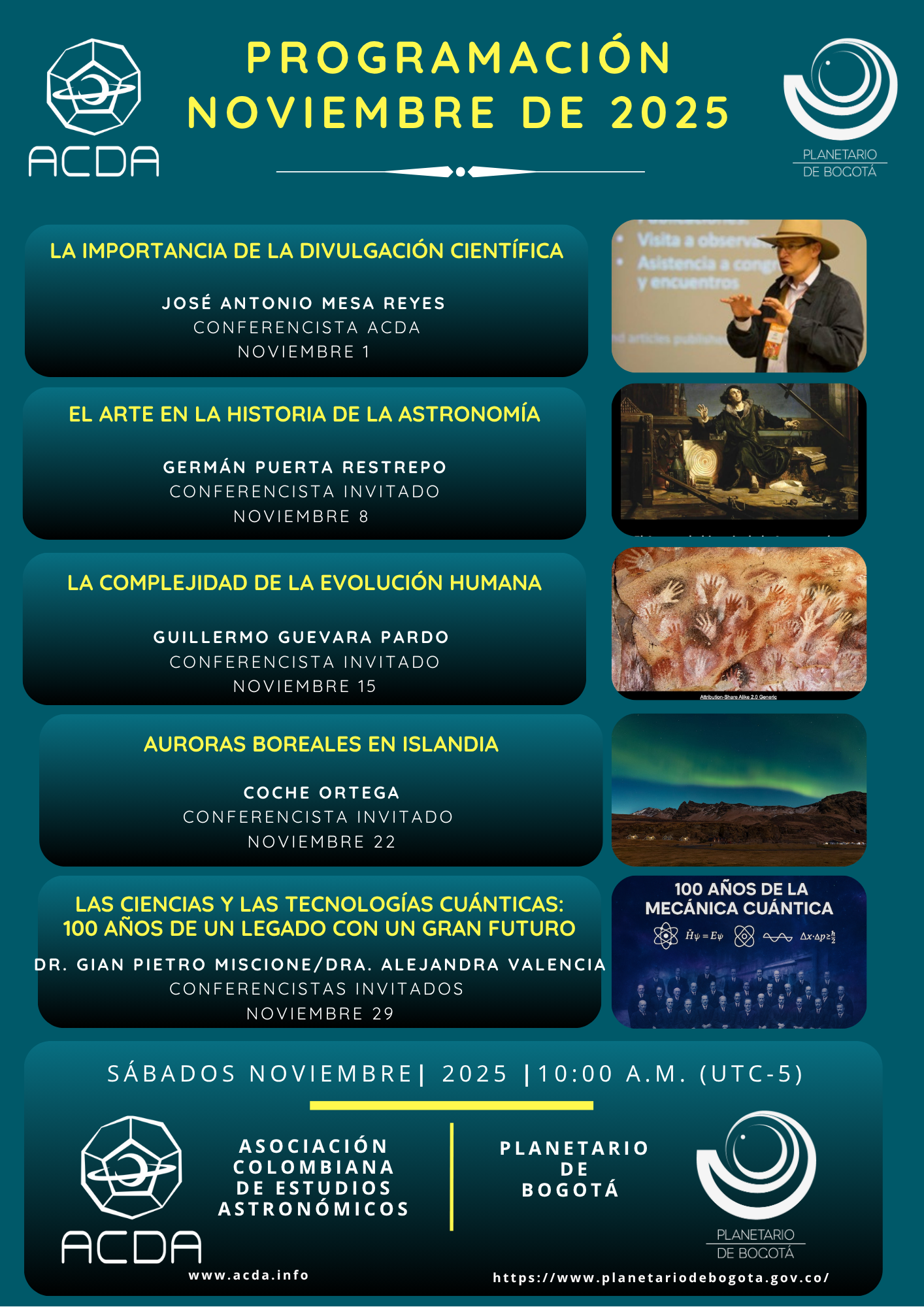 Desde hace 30 años trabajamos en la realización de nuestras metas por medio de conferencias, talleres, conversatorio, cine-fotos, ciclos de conferencias, cursos y jornadas de observación dirigidos a los aficionados y al público general.